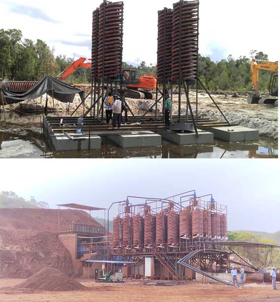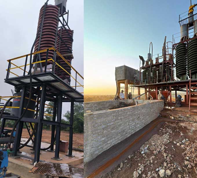 Spiral chute will stand up, calibrate the vertical line, fixed in a suitable position with iron frame or wood, the sand pump will send the ore to the top of the spiral two inlets, add supplementary water, adjust the concentration of the ore paddle, the ore paddle naturally from high to downward spiral flow, in the rotating slope flow rate to produce a kind of inertia of centrifugal force to the specific gravity of the ore sand, particle size, shape differences, through the role of gravity and centrifugal force of the spiral flow, the ore and sand are separated, the concentrate flows into the concentrate bucket with a pipe to pick up, the tailing sand flows into the tailing sand bucket with a pipe to the sand pond, and then discharged with a sand pump, completing the whole process of mineral processing.